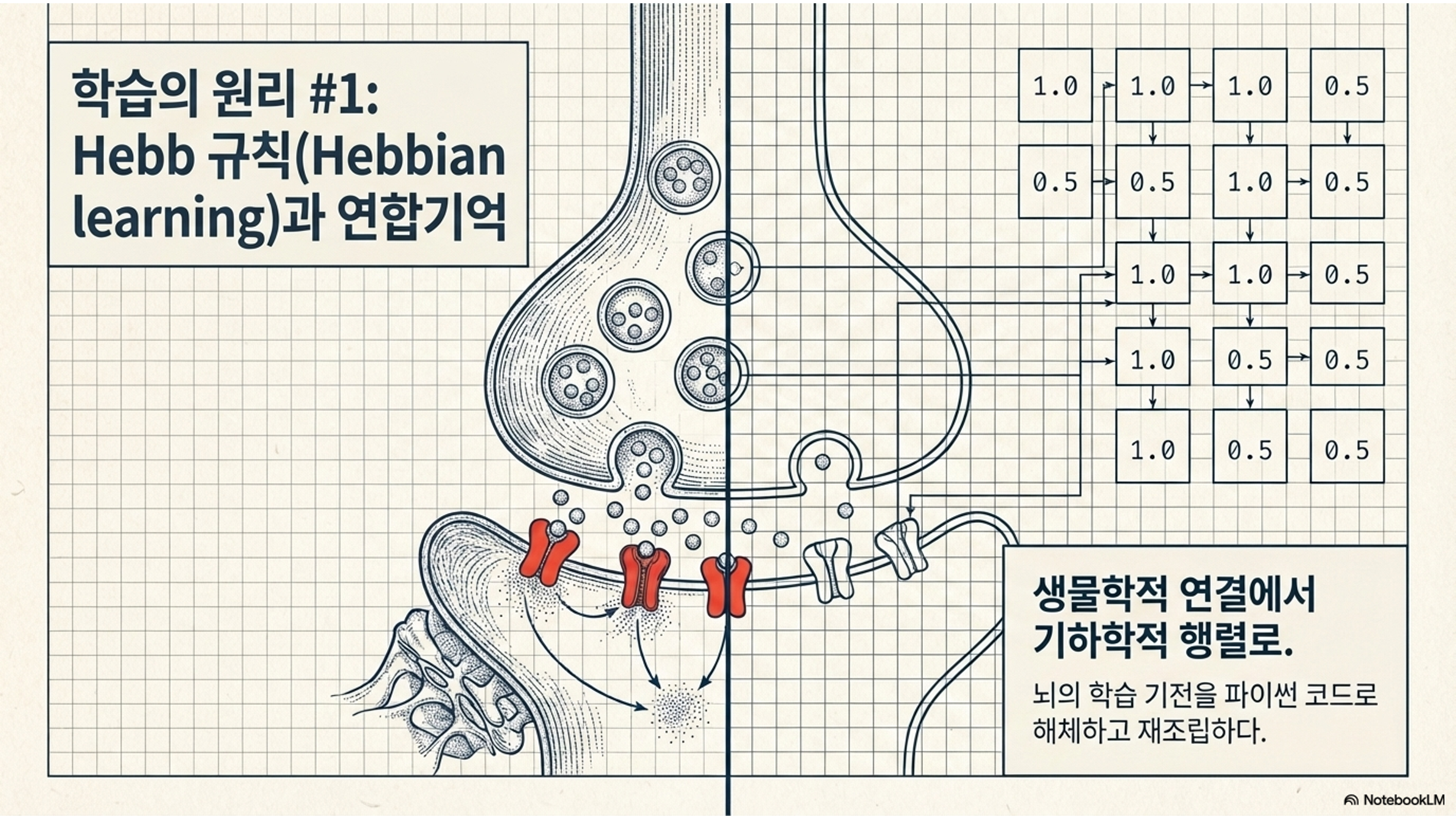 1949년 도널드 헵(Donald Hebb)은 “두 뉴런이 동시에 활성화될 때, 둘 사이의 연결 강도(시냅스)가 증가한다(Cells that fire together, wire together)”는 가설을 제안함. 이는 뇌가 외부 자극 패턴을 물리적인 연결구조로 각인시키는 비지도 학습의 기초임.