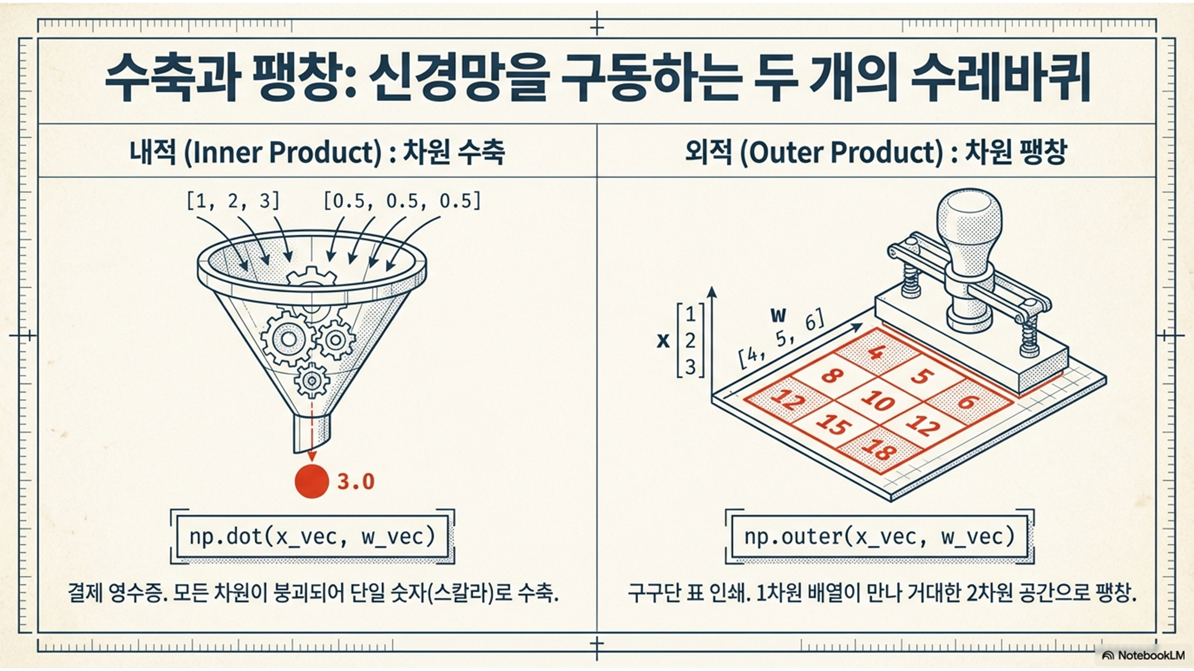 import numpy as np # 선형대수 고속 연산을 위한 numpy 라이브러리를 np 약칭으로 임포트함# 1. 1차원 벡터 준비 (크기가 3인 배열)x_vec = np.array([1, 2, 3]) # 입력값 역할을 할 1차원 배열(크기 3)을 생성하여 x_vec 변수에 할당함w_vec = np.array([0.5, 0.5, 0.5]) # 가중치 역할을 할 1차원 배열(크기 3)을 생성하여 w_vec 변수에 할당함# 2. 내적(Inner Product) 연산: 차원의 수축# (1*0.5) + (2*0.5) + (3*0.5) = 0.5 + 1.0 + 1.5 = 3.0inner_result = np.dot(x_vec, w_vec) # 같은 위치의 원소끼리 짝지어 곱하고 모두 더한 단일 스칼라 값을 계산함print("=== [실습 1-1] 내적 연산 (결제 영수증) ===") # 실습 결과를 구분하는 헤더 출력print(f"내적 결과: {inner_result} (모든 차원이 붕괴되어 단일 숫자 스칼라로 수축됨)") # 계산된 스칼라 값을 포맷팅하여 출력# 3. 외적(Outer Product) 연산: 차원의 팽창# np.outer()는 첫 번째 인자를 세로로, 두 번째 인자를 가로로 교차하여 모든 쌍을 곱함.outer_result = np.outer(x_vec, w_vec) # x_vec을 열(세로)로, w_vec을 행(가로)으로 취급하여 1:1로 교차 곱한 3x3 행렬을 반환함print("\n=== [실습 1-1] 외적 연산 (구구단 표 인쇄) ===") # 줄바꿈과 함께 외적 결과 헤더 출력print(f"외적 결과:\n{outer_result}") # 3x3 행렬 구조로 팽창된 배열을 화면에 출력print("-> 해설: 1차원 배열 2개가 만나 3x3 크기의 거대한 2차원 가중치 행렬(맵)로 차원이 팽창함!") # 외적의 기하학적 의미 해설