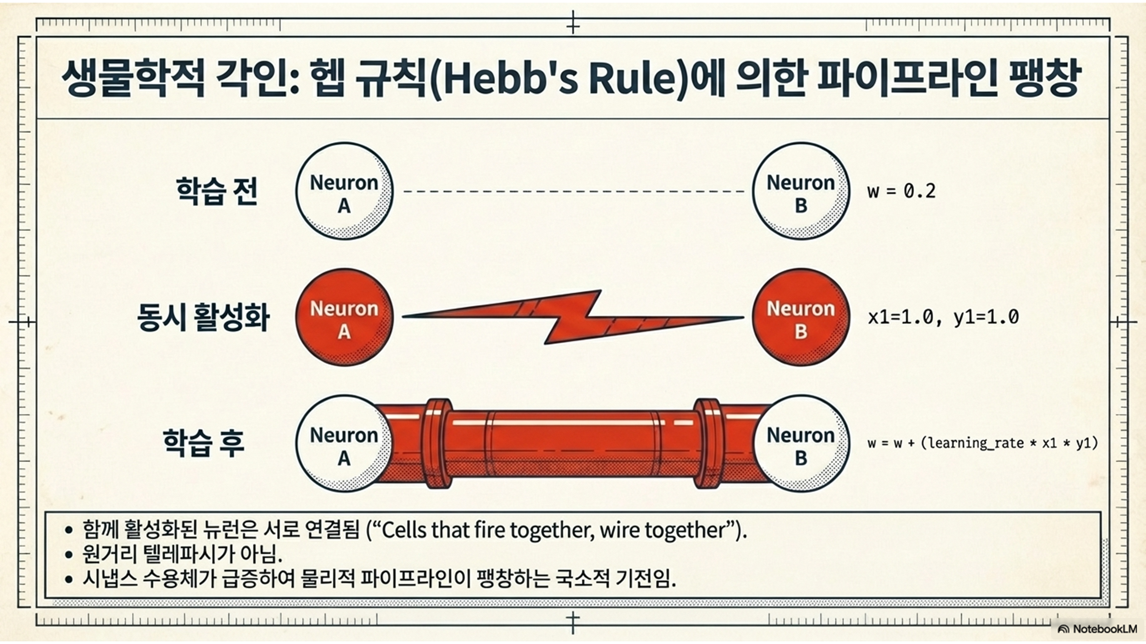 # 1. 시냅스 초기 상태 및 하이퍼파라미터 세팅w =0.2# 맞닿아 있는 두 뉴런을 잇는 시냅스 파이프의 초기 두께(가중치)를 0.2로 얕게 세팅함learning_rate =0.1# 한 번의 동시 활성화 경험당 파이프 두께를 얼마나 크게 늘릴지 결정하는 학습률(보폭)print(f"[학습 전] 초기 시냅스 가중치(파이프 두께): {w:.2f}") # 학습 전의 베이스라인 가중치 출력# 2. 첫 번째 경험 (Fire together: 동시 활성화)x1 =1.0# 앞쪽 뉴런(입력)이 강하게 전기 신호를 뿜어낸(fire) 켜짐 상태(1.0)y1 =1.0# 뒤쪽 뉴런(출력)도 연이어 강하게 전기 신호를 뿜어낸(fire) 켜짐 상태(1.0)delta_w1 = learning_rate * x1 * y1 # 헵 규칙 공식(학습률 * 입력값 * 출력값)으로 파이프 두께 변화량을 계산함w = w + delta_w1 # 기존 파이프 두께(w)에 변화량(delta_w1)을 덧셈 누적하여 시냅스를 업데이트함print(f"[1회차 학습] 두 뉴런 동시 활성화 -> 파이프 두께 증가량: +{delta_w1:.2f} | 업데이트된 가중치: {w:.2f}") # 동시 활성화로 인해 가중치가 증가한 결과 출력# 3. 두 번째 경험 (Fire independently: 단독 활성화)x2 =1.0# 앞쪽 뉴런만 전기 신호를 뿜어냄 (켜짐)y2 =0.0# 뒤쪽 뉴런은 반응하지 않고 침묵함 (동시 활성화 실패)delta_w2 = learning_rate * x2 * y2 # y2가 0이므로 변화량 연산 결과가 0이 되어 파이프 두께가 늘어나지 않음w = w + delta_w2 # 기존 가중치에 0을 더하므로 이전 상태를 그대로 유지함print(f"[2회차 학습] 한 뉴런만 활성화 -> 파이프 두께 증가량: +{delta_w2:.2f} | 업데이트된 가중치: {w:.2f}") # 한쪽만 켜졌을 땐 가중치가 변하지 않음을 증명하여 출력