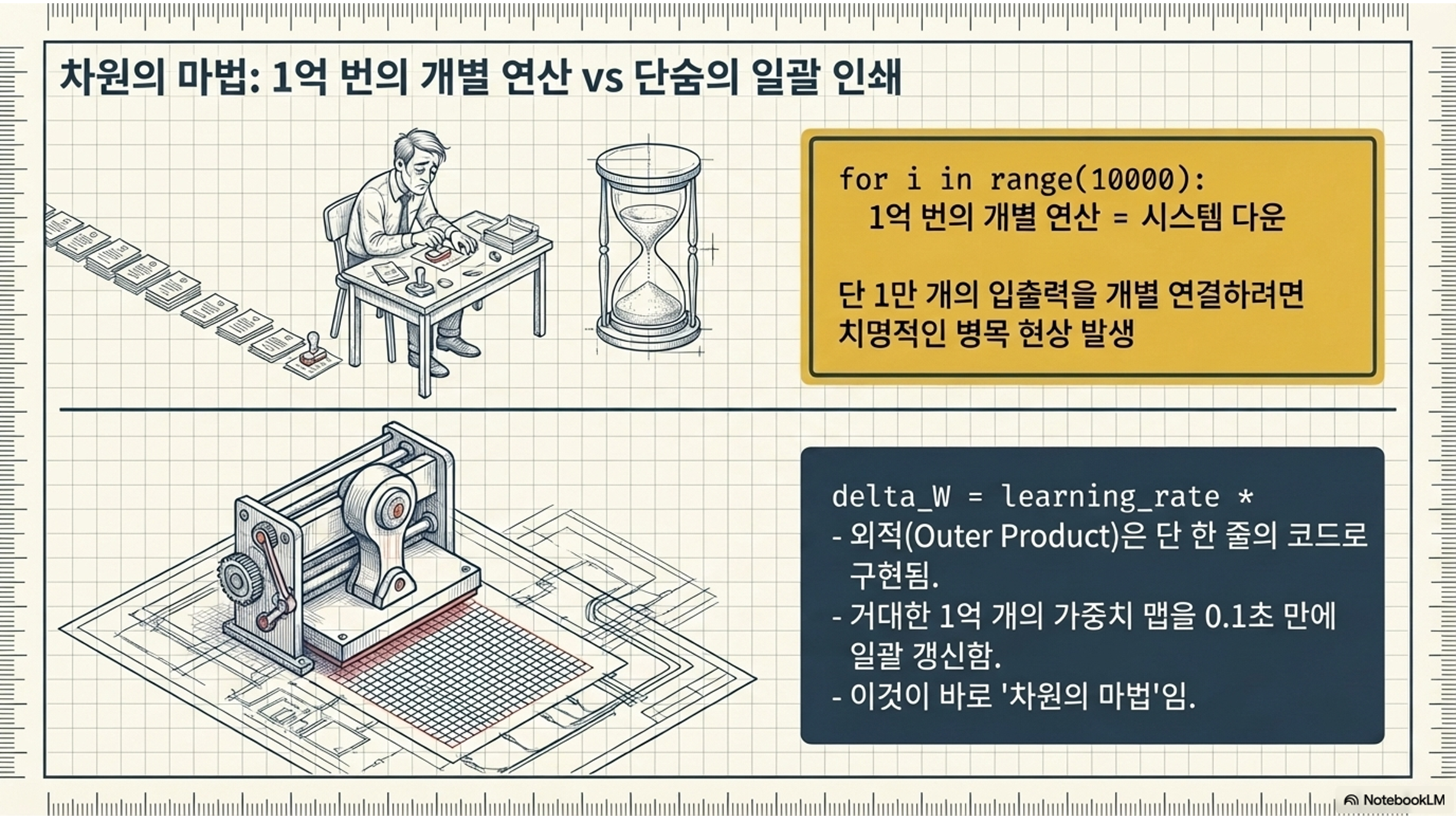 [그림 4] 차원의 마법: 1억 번의 개별 연산 vs 단숨의 일괄 인쇄