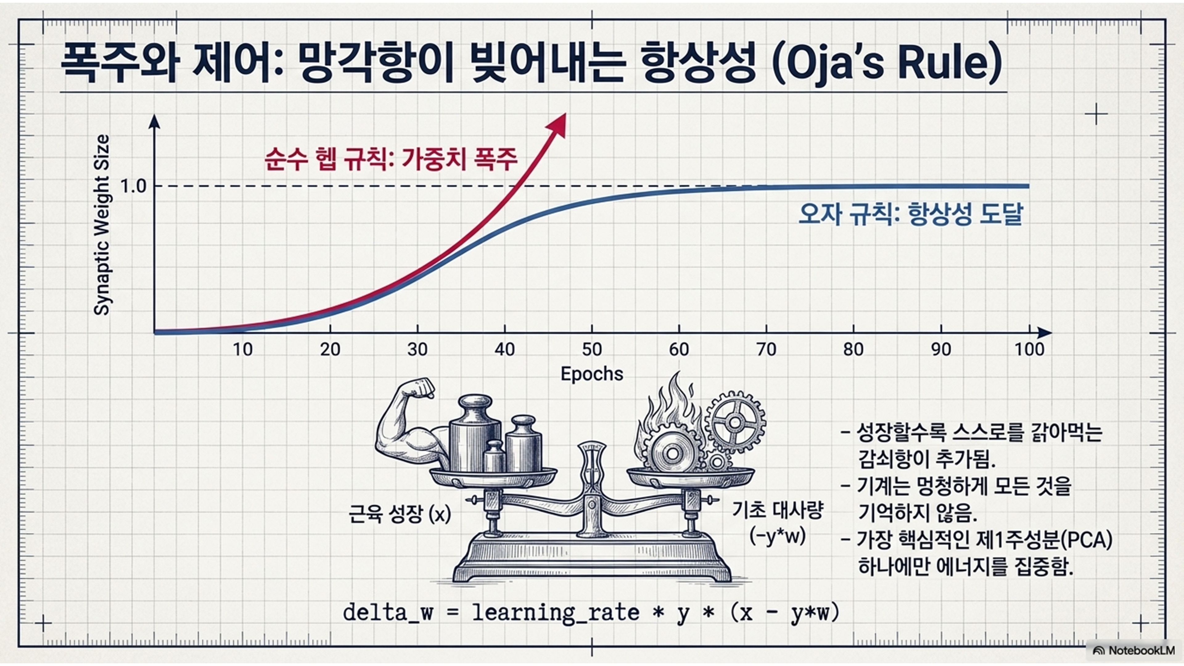 망각항의 수학적 의미와 주성분 분석: 수식 괄호 안의 빼기 부분, 즉 망각항(\(-yw\))이 바로 폭주를 제어하는 브레이크 역할을 함. 파이프가 굵어질수록(\(w\)가 커질수록) 빼주는 감쇠값도 같이 커져, 결국 특정 한계치(1.0)에 수렴하도록 시스템을 자동 강제함.