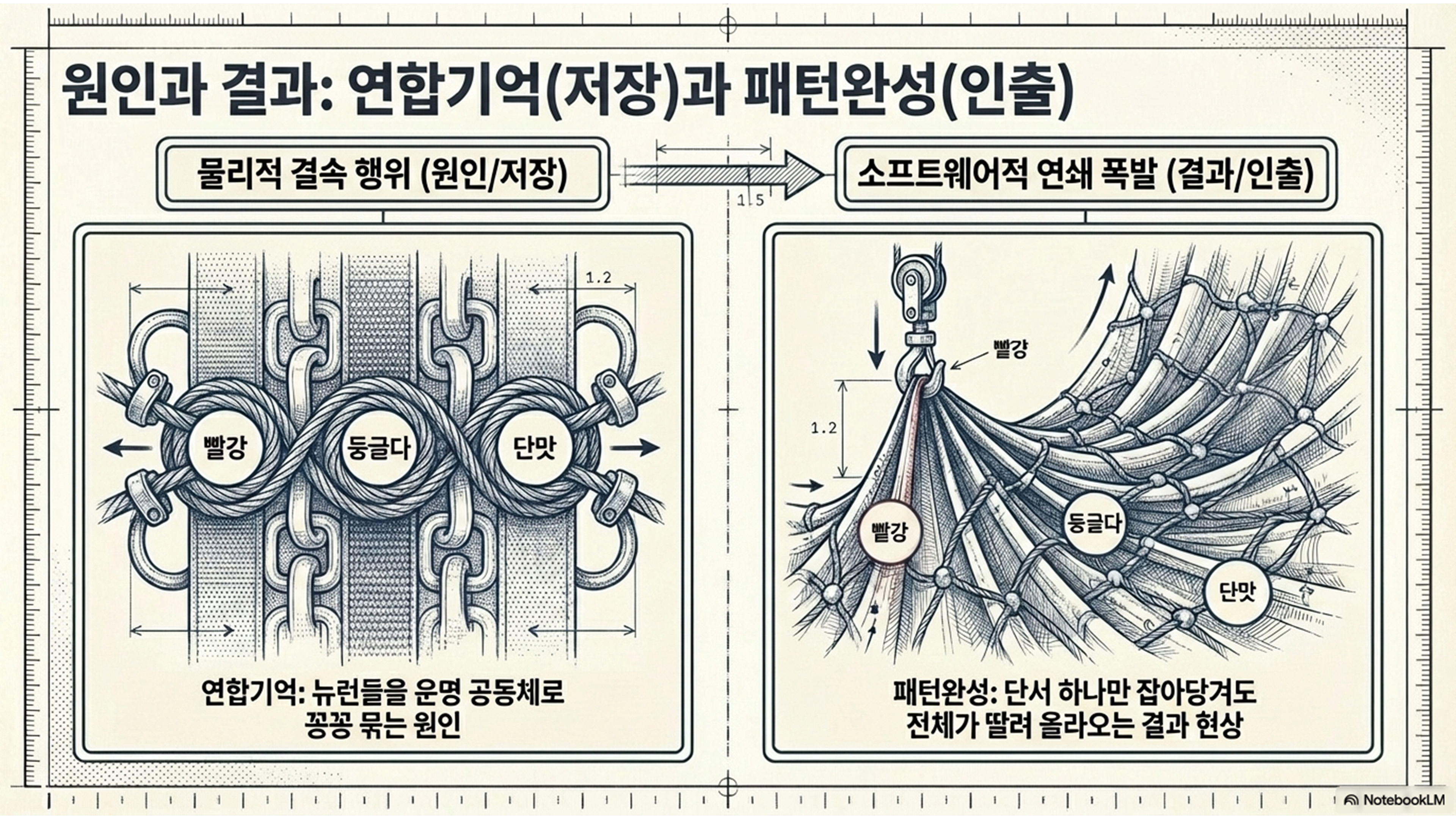 비유: 연합기억은 벨크로(찍찍이)의 수많은 갈고리와 실을 꽉 맞물리게 꾹 눌러 붙이는 끈끈한 물리적 접착 행위(원인)임. 패턴 완성은 훗날 그 찍찍이의 한쪽 모서리(단서)만 잡고 들어 올려도, 꽉 맞물려 있는 가중치 구조 때문에 나머지 거대한 천 전체가 통째로 허공으로 딸려 올라오는 복원 현상(결과)임.
