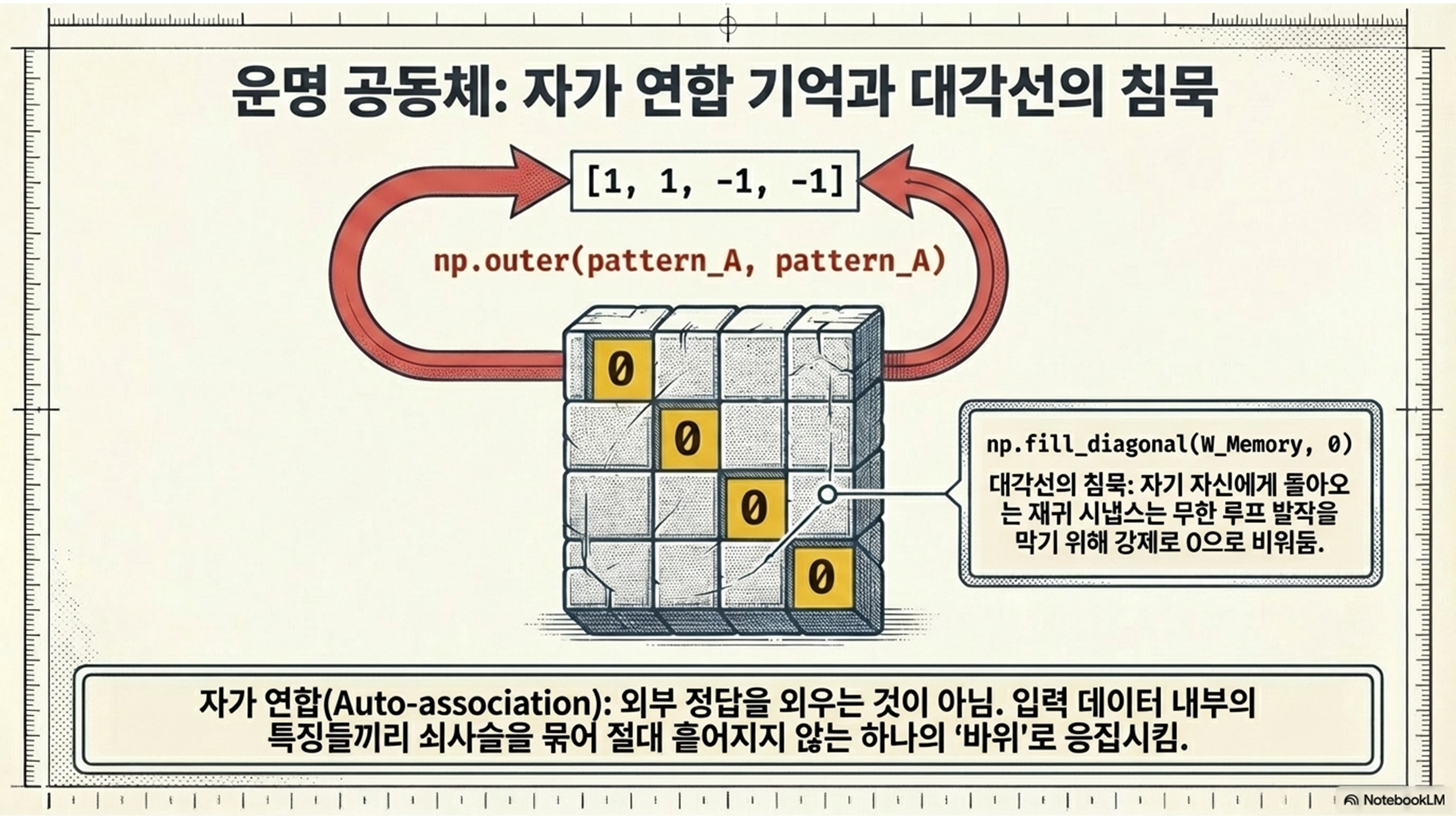 # 1. 뇌에 각인시킬 완벽한 원본 패턴 A 생성 (사과의 특징 패턴)pattern_A = np.array([1, 1, -1, -1]) # 사과를 특정하는 4개의 특징 요소를 양극성(-1, 1) 이진 배열(벡터)로 생성하여 변수에 할당함# 2. 4 x 4 크기의 빈 가중치 장부(맵) 준비W_Memory = np.zeros((4, 4)) # 4개의 특징 뉴런들이 교차로 얽힐 수 있도록 4 x 4 크기의 영행렬(빈 아스팔트 도화지)을 생성함# 3. 자기 자신과의 외적을 통해 뇌에 패턴을 쇠사슬로 묶어 아스팔트 포장(각인)함W_Memory += np.outer(pattern_A, pattern_A) # 패턴 A를 스스로와 교차 곱(외적) 연산하여, 그 결과물인 4 x 4 관계망을 기존 기억 맵(W_Memory)에 덧셈(+=)으로 영구 각인함# [중요] 자기 자신에게 돌아오는 재귀 시냅스(대각선 위치)는 무한 루프 증폭을 막기 위해 강제로 0으로 비워둠np.fill_diagonal(W_Memory, 0) # 넘파이의 대각선 조작 함수를 써서 정방행렬의 대각선 원소들(i=j)만 깔끔하게 0으로 초기화하여 신경망의 발작을 막음print("=== [실습 2-1] 자가 연합을 통한 단일 기억의 접착(원인) ===") # 1번 패턴 저장이 완료되었음을 알리는 출력print(f"패턴 A 내부 요소들끼리 끈끈하게 각인된 가중치 도로망:\n{W_Memory}") # 사과를 구성하는 4개 노드 간의 호감도(가중치)가 어떻게 세팅되었는지 행렬 형태로 화면에 보여줌
