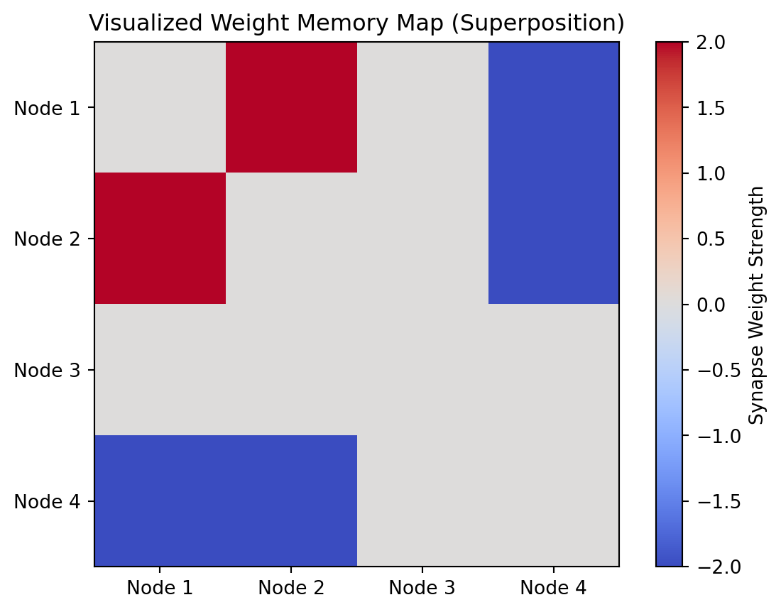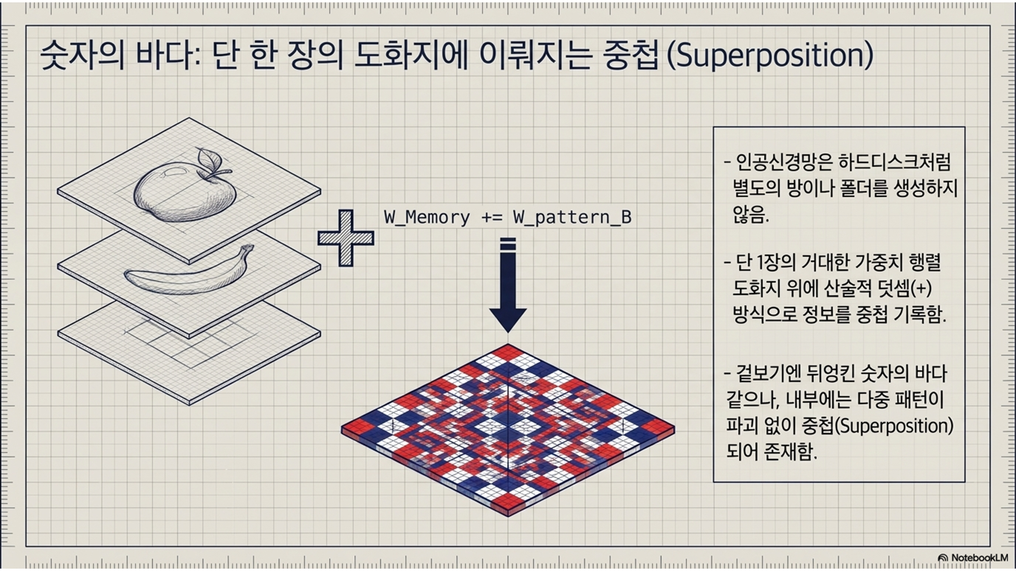 이론적 설명: 인공신경망은 새로운 정보를 저장할 때 하드디스크처럼 방이나 폴더를 새로 만들지 않음. 오직 단 한 장의 거대한 가중치 행렬 도화지 안에 여러 패턴을 동시에 겹쳐 씀.
