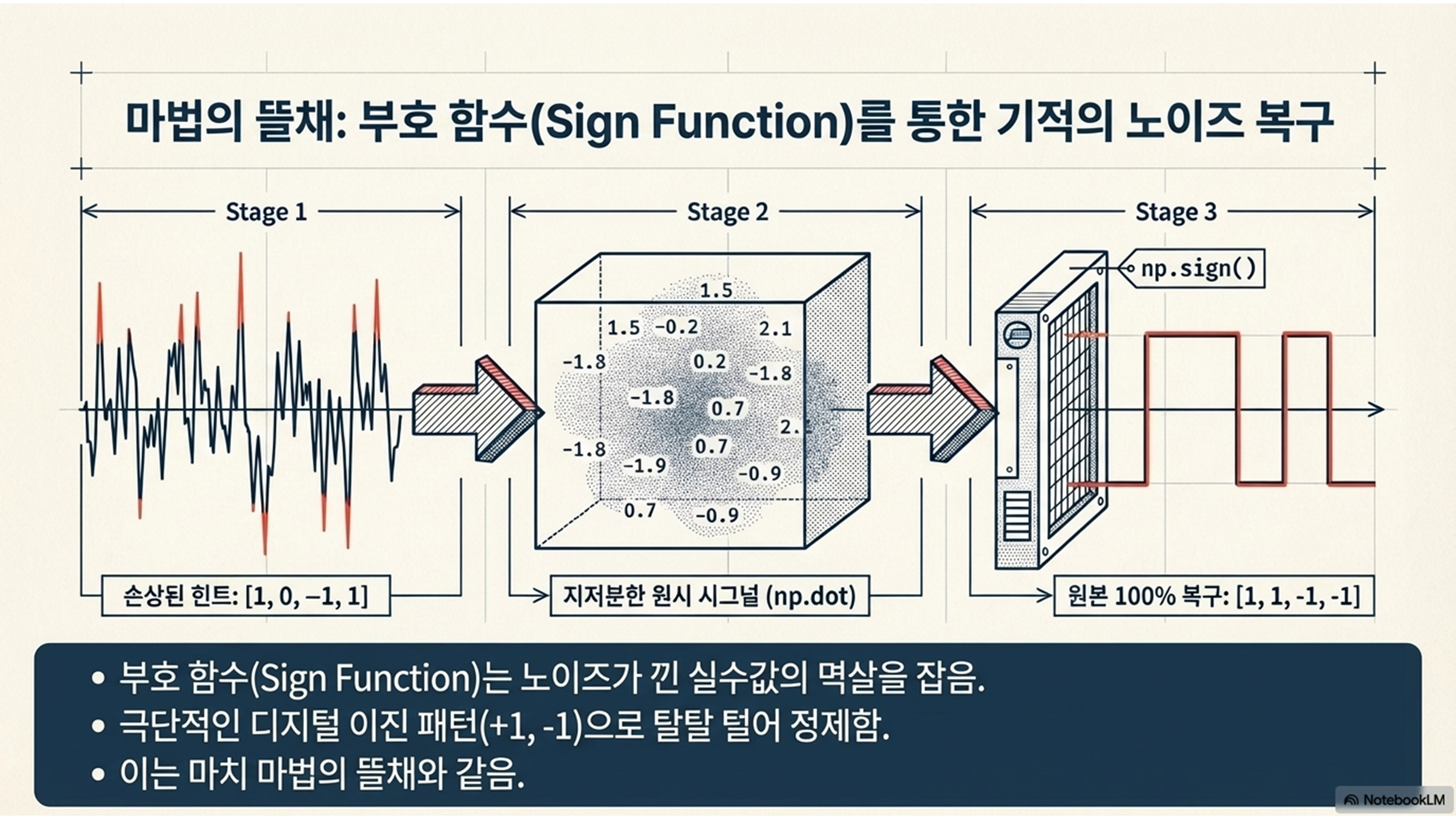 -> 해설: 듬성듬성 끊어진 가중치 도로망 때문에 시그널이 약해졌지만, '원래 쥐고 있던 힌트(잔상)'와 '네트워크의 연상'이 덧셈으로 상호보완되어 완벽한 패턴 A 원본[1, 1, -1, -1]을 복구해냄!