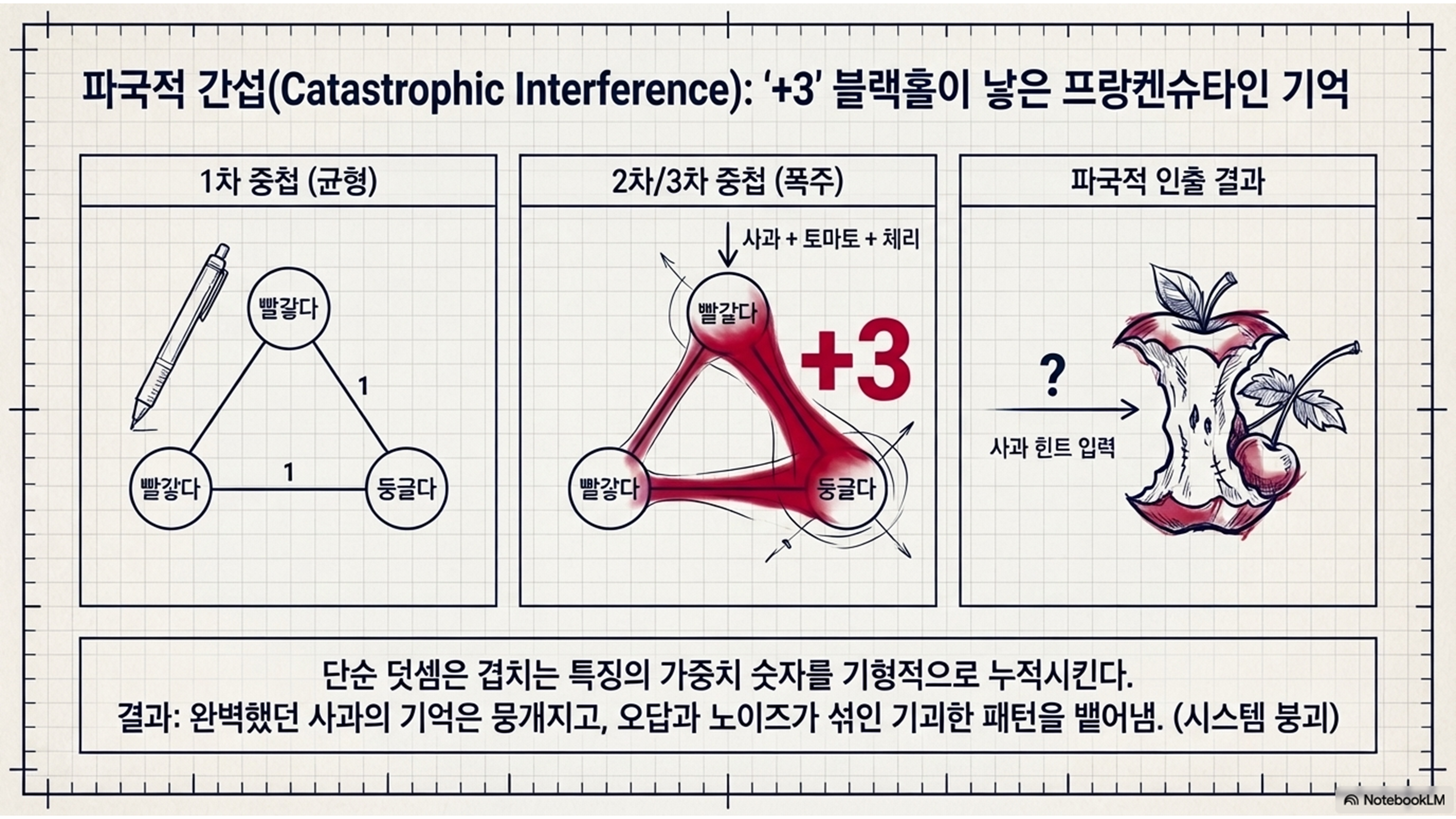 덧칠의 결과: 결국 나중에 ‘사과’ 단서(cue)만 넣고 꺼내려 해도(사과의 특징[예: 완벽한 사과 모양의 입력값]을 힌트로 줘서 오직 ’사과’라는 깨끗한 정답 하나만 출력해내려고 시도해도), 사과와 토마토의 가중치 잉크가 한 덩어리로 뭉개져버려서(떡져버려서) 정체불명의 괴물 기억을 뱉어내는 참사가 벌어짐. \(\Rightarrow\) 분명히 사과 단서를 줬는데도, 도화지 안의 가중치가 너무 심하게 오염되어 있어서 신경망이 헛갈리게 됨. 결과적으로 사과의 ’달콤함’과 토마토의 ’물컹함’이 마구잡이로 뒤섞인, 사과도 토마토도 아닌 정체불명의 괴물 패턴(오답)을 화면에 뱉어내게 됨. 이것이 바로 파국적 간섭의 비극임.