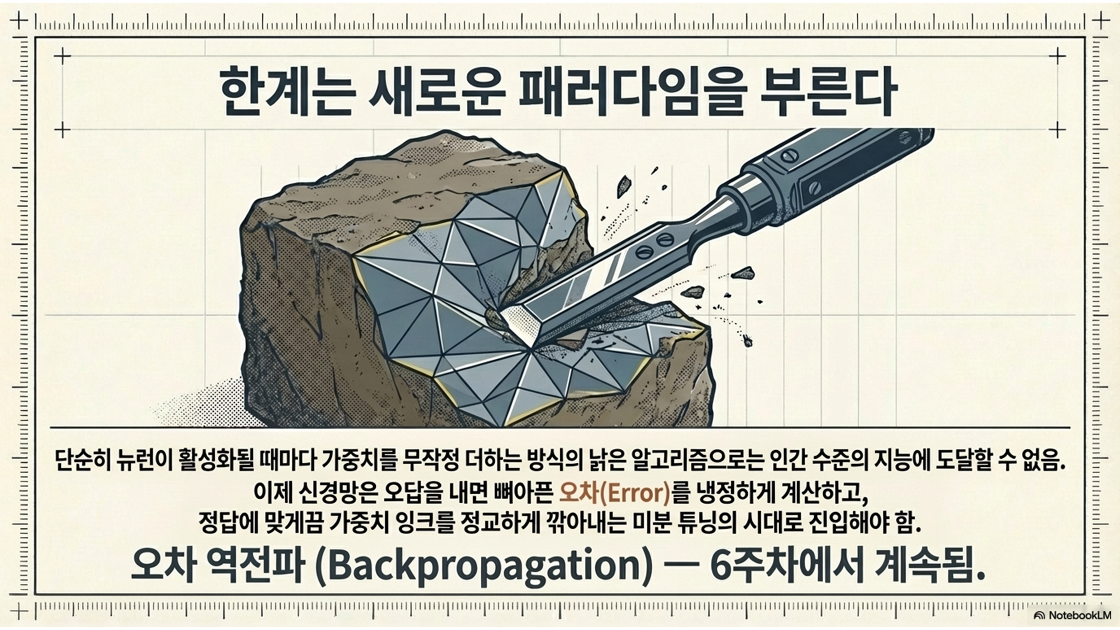 6주차 수업에서 등장할 현대 딥러닝의 심장, 델타 규칙(delta rule)과 오차 역전파 학습의 탄생을 부르는 역사적 당위성이 됨.
