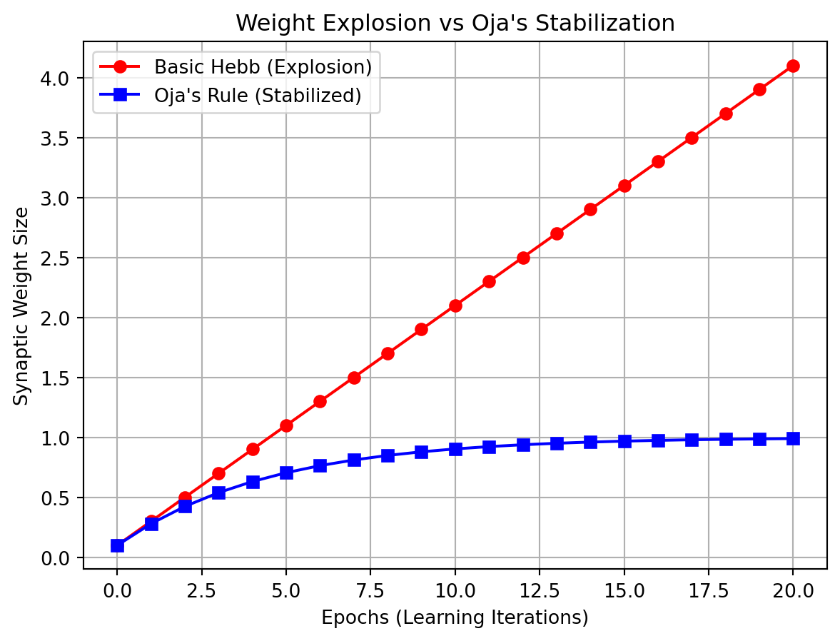import matplotlib.pyplot as plt # 반복 학습에 따른 가중치 변화(팽창/수렴)를 꺾은선 그래프로 그리기 위해 임포트함w_hebb =0.1# 끝없이 폭발할 순수 헵 규칙의 초기 가중치(0.1)를 세팅함w_oja =0.1# 브레이크가 달린 오자 규칙의 초기 가중치(0.1)를 동일하게 세팅함learning_rate =0.2# 두 모델 모두에 공평하게 적용할 학습률을 0.2로 설정함epochs =20# 두 뉴런이 동시 활성화되는 동일한 자극 경험을 20회 반복 주입함history_hebb = [w_hebb] # 반복할 때마다 변하는 헵 규칙의 가중치 팽창 기록을 저장할 빈 리스트 생성history_oja = [w_oja] # 반복할 때마다 변하는 오자 규칙의 가중치 수렴 기록을 저장할 빈 리스트 생성for i inrange(epochs): # 20번의 에포크(경험)를 반복하는 for 루프 시작 x, y =1.0, 1.0# 20번 내내 두 뉴런이 1.0으로 동시 활성화되는 가혹한 켜짐 조건 주입# 1. 기본 헵 규칙(브레이크 없음) w_hebb += learning_rate * x * y # 순수 헵 규칙 변화량을 기존 가중치에 덧셈 누적하여 팽창시킴 history_hebb.append(w_hebb) # 팽창한 수치를 히스토리 리스트에 추가함# 2. 오자 규칙(망각항 제동 장치 장착) delta_w_oja = learning_rate * y * (x - y * w_oja) # 오자 공식: 괄호 안의 감쇠항(-y*w)이 현재 가중치 크기에 비례하여 변화량을 깎아내림 w_oja += delta_w_oja # 감쇠되어 계산된 안전한 변화량을 오자 가중치에 덧셈 업데이트함 history_oja.append(w_oja) # 수렴해가는 수치를 히스토리 리스트에 추가함# 폭발하는 그래프와 안정화되는 그래프의 시각적 비교plt.plot(history_hebb, marker='o', color='red', label='Basic Hebb (Explosion)') # 순수 헵 규칙의 궤적을 붉은색 선과 원형 마커로 그림plt.plot(history_oja, marker='s', color='blue', label="Oja's Rule (Stabilized)") # 오자 규칙의 궤적을 푸른색 선과 사각형 마커로 겹쳐서 그림plt.title("Weight Explosion vs Oja's Stabilization") # 그래프 상단에 두 방식의 비교를 알리는 영문 제목을 달아줌plt.xlabel("Epochs (Learning Iterations)") # X축이 누적된 반복 학습 횟수임을 설명하는 라벨plt.ylabel("Synaptic Weight Size") # Y축이 커지거나 안정화되는 시냅스 가중치의 크기임을 설명하는 라벨plt.legend() # 빨간선과 파란선이 각각 무엇을 의미하는지 우측 상단에 범례 표지판을 띄움plt.grid(True) # 눈대중으로 수치를 읽기 편하도록 그래프 배경에 희미한 격자 무늬를 켬plt.show() # 모든 그리기 설정이 끝난 캔버스를 최종적으로 화면에 렌더링하여 보여줌